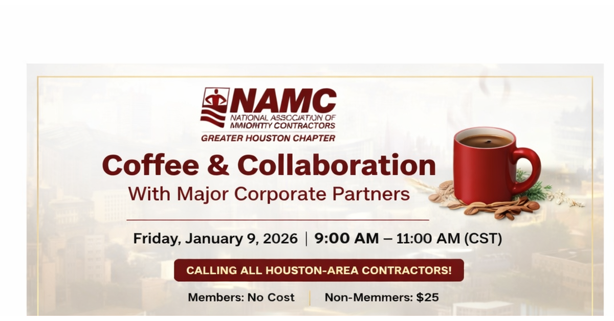 Join us for an exclusive morning of connection, collaboration, and construction industry insight! We’re bringing together Houston’s top corporate partners and industry leaders for a power-packed session designed to build relationships, share upcoming projects, and spark partnerships that move our industry forward. Let’s connect. Let’s collaborate. Let’s build what’s next—together. #NAMCHouston #BuildingTogether #ConstructionLeadership #PartnershipsThatBuild Members No Cost Non-Members - $25.00Coffee & Collaboration with Major Corporate Partners